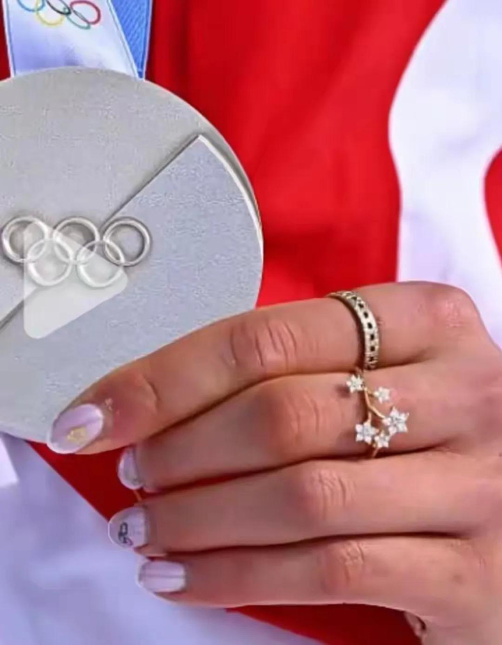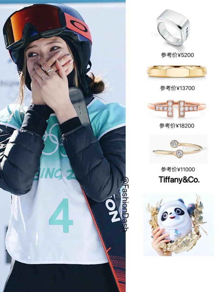 谷爱凌将两枚银牌和这枚U槽的金牌一起挂在脖子上,她太厉害了,两届冬奥会,参加了六场比赛,拿到了六枚奖牌,而且都是金银牌,她都没看过铜牌长什么样子,这就是谷爱凌的实力。谷爱凌手上戴的戒指,一枚是Tiffany&Co.T系列的镶钻戒指,一枚是T系列True宅式镶钻戒指,这两枚戒指加起来要将近8万块。