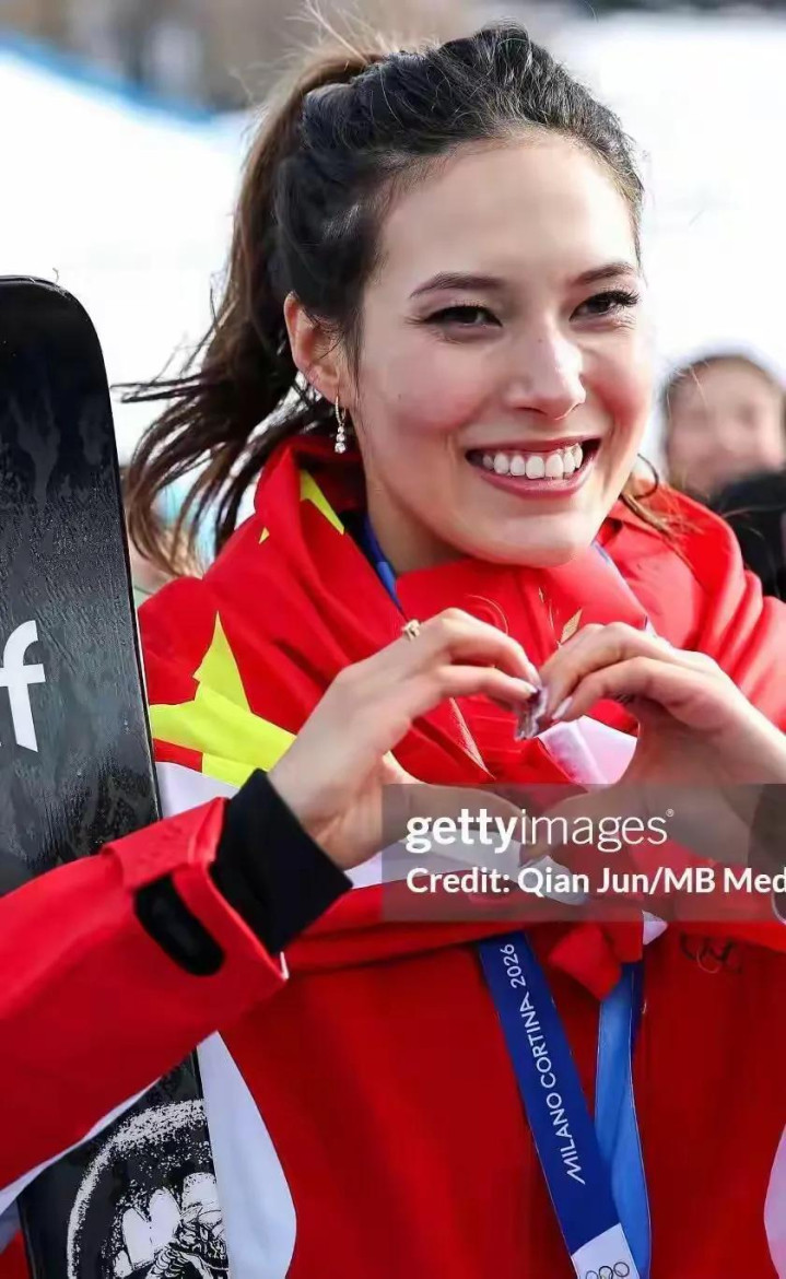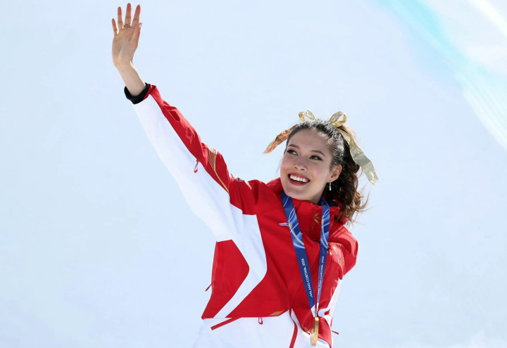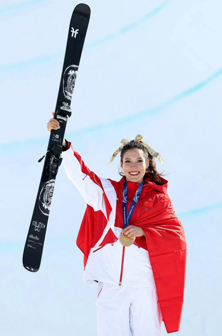 谷爱凌戴着金色发带站在了U槽冠军的领奖台上,她蝉联了奥运会冠军,站在这里的谷爱凌很美,她的笑容灿烂且自信。谷爱凌拿到的是中国代表团的第五金,米兰冬奥会我们完美收官啦!