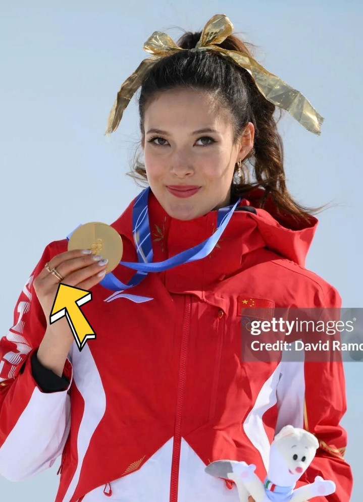 谷爱凌领奖时,戴的全是金色配饰,从发带到腕表、戒指全是金色的,金色与她很配。