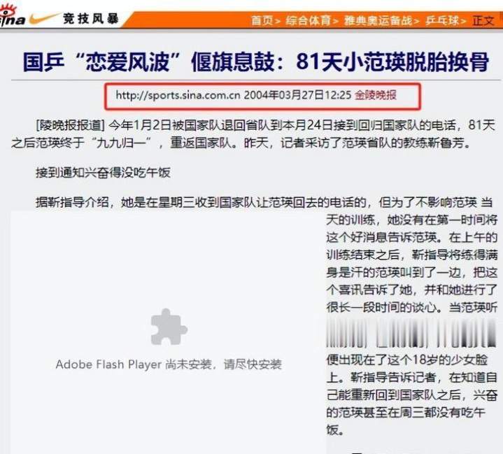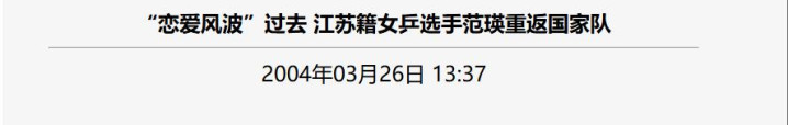中国新闻网:《“恋爱风波”过去 江苏籍女乒选手范瑛重返国家队》发布时间:2004.3.26