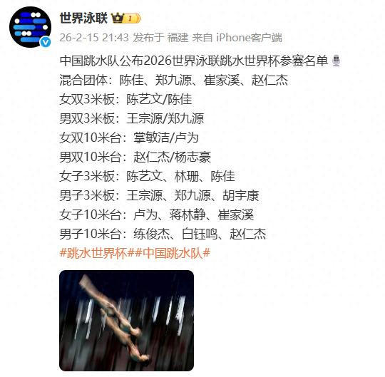 2月15日,世界泳联公布中国跳水队2026世界泳联跳水世界杯参赛名单。名单如下: